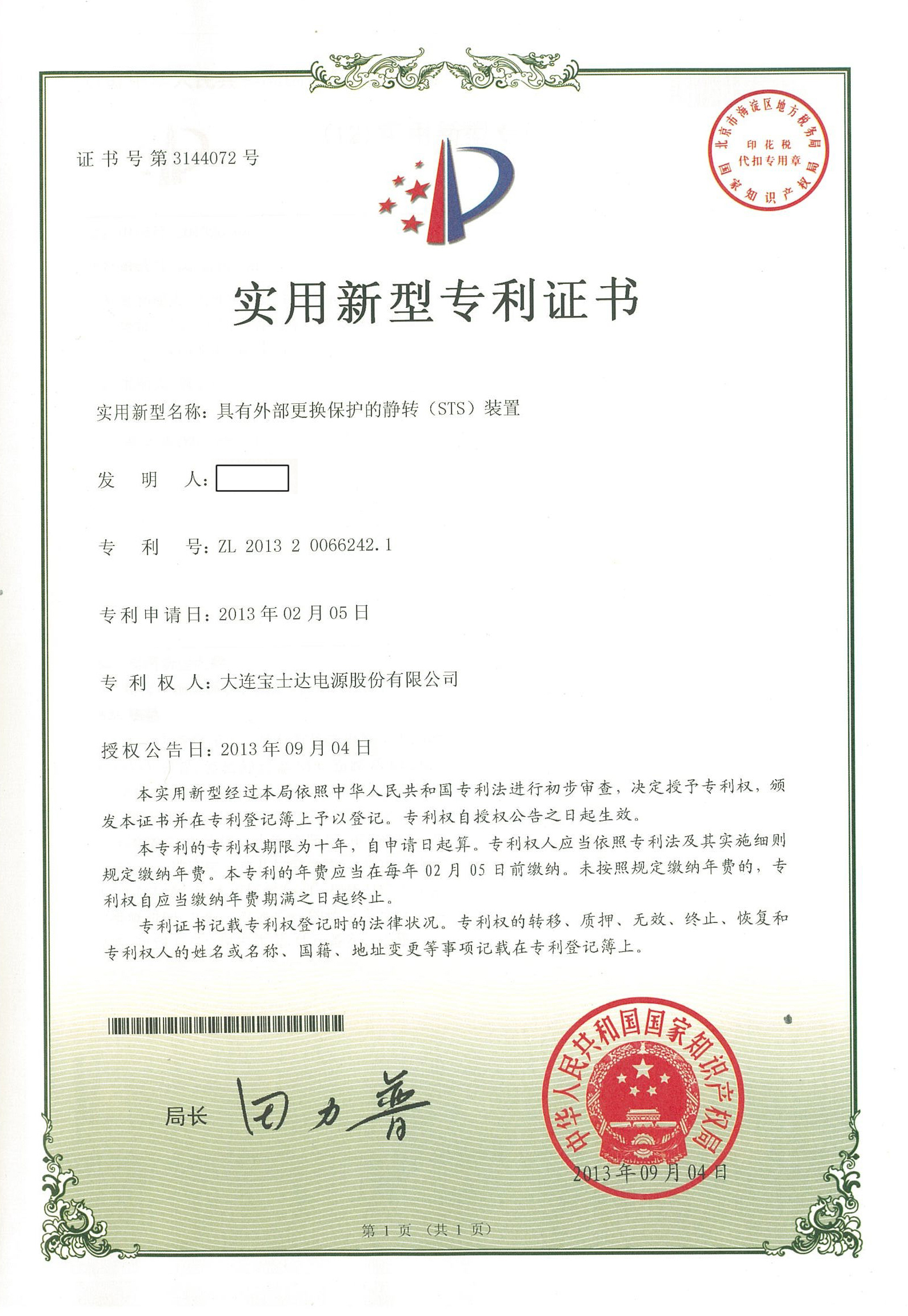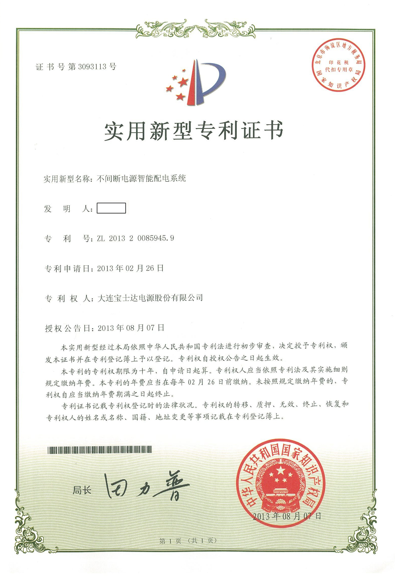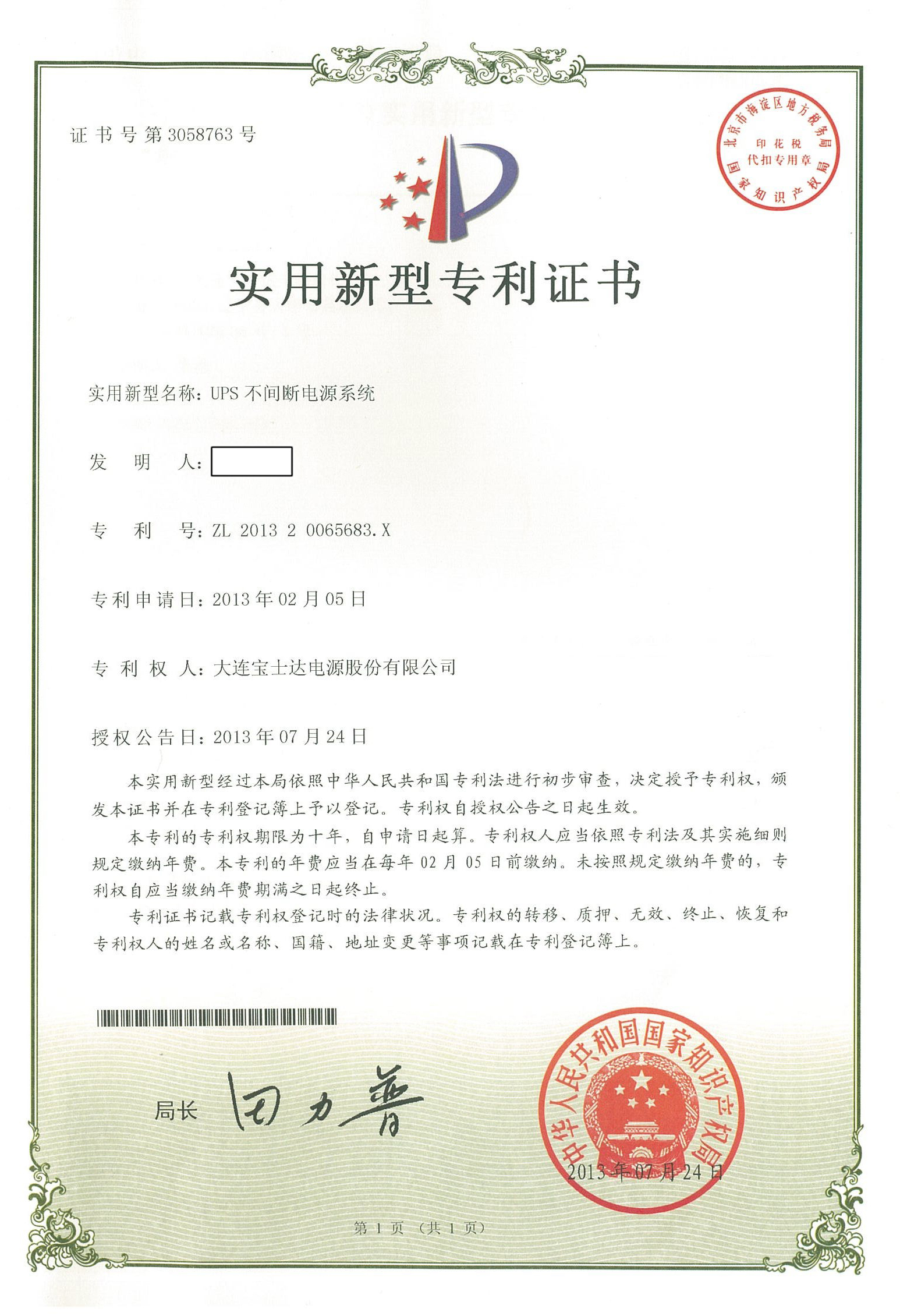 近日,寶士達(dá)UPS電源一批實(shí)用新型專利通過國(guó)家知識(shí)產(chǎn)權(quán)局審查并獲得頒發(fā)的專利證書,其中包括:UPS不間斷電源系統(tǒng)(專利號(hào)ZL 2013 2 0065683.X),一種數(shù)字化處理控制的在線式不間斷電源(專利號(hào)ZL 2013 2 0065997.X),小型機(jī)房監(jiān)控系統(tǒng)(ZL 2013 2 0065790.2),不間斷電源智能配電系統(tǒng)(ZL 2013 2 0085945.9),具有外部更換保護(hù)的靜轉(zhuǎn)(STS)裝置(專利號(hào)ZL 2013 2 0066242.1),節(jié)能自耦調(diào)壓裝置(專利號(hào)ZL 2013 2 0033012.5)等。