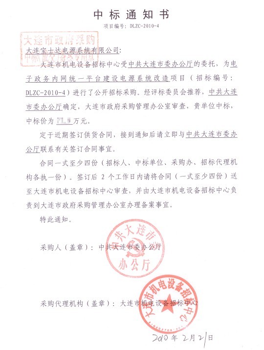 近日,大連寶士達電源系統(tǒng)有限公司成功中標(biāo)中共大連市委辦公廳電子政務(wù)內(nèi)網(wǎng)統(tǒng)一平臺電源改造項目,為其機房的升級改造提供安全的電力保障。