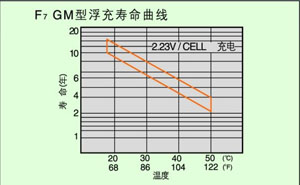GM型充電電壓2.23-2.25V/單體,溫度在15-25℃時(shí),壽命達(dá)15年見F7。