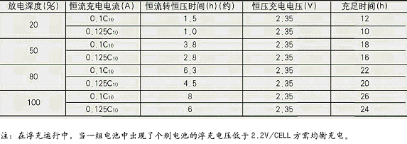 均衡充電采用先恒流,后按GM型2.35V/單體恒壓充電,充電時(shí)間取決于放電深度。見下表: