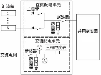 內(nèi)含直流配電單元和交流配電單元,其中直流配電單元主要是將匯流箱輸入的直流電源進(jìn)行匯流后接入逆變器,該配電單元含直流輸入斷路器、防反二極管、光伏防雷器;交流配電單元主要是通過配電給逆變器提供并網(wǎng)接口,該配電單元含網(wǎng)側(cè)斷路器、防雷器,配置發(fā)電計(jì)量表、逆變器并網(wǎng)接口及交流電壓電流表等裝置。