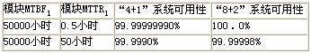根據(jù)上述公式可以計(jì)算出在MTBF1=5萬(wàn)小時(shí),MTTR1=0.5小時(shí)時(shí)的“4+1”和“8+2”系統(tǒng)的可用度為: