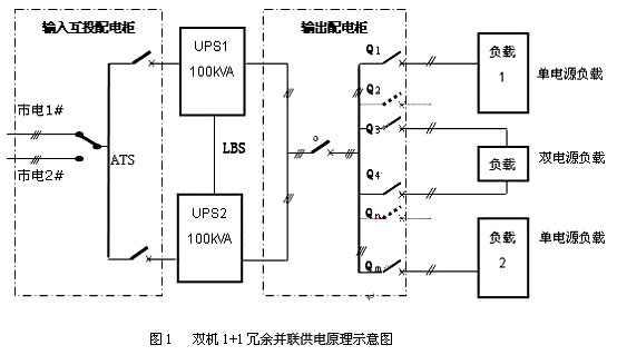 為了容易分析,在這里只用兩臺UPS作1+1冗余并機(jī),如圖1所示。后面的所有負(fù)載之和小于100kVA,兩臺UPS的輸出電壓在輸出配電柜內(nèi)直接并機(jī),然后再通過開關(guān)Q給負(fù)載供電。如果遇到雙電源負(fù)載就可以分別從輸出配電柜上各引一路到負(fù)載,同時滿足雙電源輸入的條件,如圖中Q3、Q4所示。