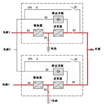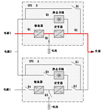 負(fù)載由UPS A和UPS B的整流器--逆變器來供電,同時向各自的電池組充電,每臺UPS的逆變器各帶50%的負(fù)載運(yùn)行。