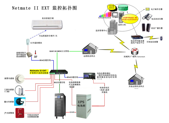 適用于小型動(dòng)力機(jī)房的UPS電源、電池組及其周邊環(huán)境狀態(tài)參量的網(wǎng)絡(luò)集中監(jiān)控管理。在監(jiān)控UPS的同時(shí)擴(kuò)展監(jiān)控環(huán)境溫濕度模塊、電池組電量檢測、電池組斷路器開關(guān)檢測、漏水檢測、門禁檢測、 煙感檢測等,在監(jiān)控UPS及其周邊環(huán)境狀態(tài)的同時(shí),需要聯(lián)動(dòng)控制本地聲光報(bào)警器報(bào)警、機(jī)房普通空調(diào)和關(guān)閉上水電磁閥保護(hù)裝置啟動(dòng)等。