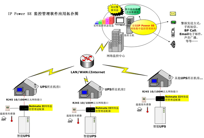 適用于對(duì)配備了Netmate II/Netmate II EXT/Netmate SE/Netmate mini/Sitemate的遠(yuǎn)程網(wǎng)絡(luò)UPS電源、UPS電池組及其周邊環(huán)境狀態(tài)參量的網(wǎng)絡(luò)集中監(jiān)控管理。