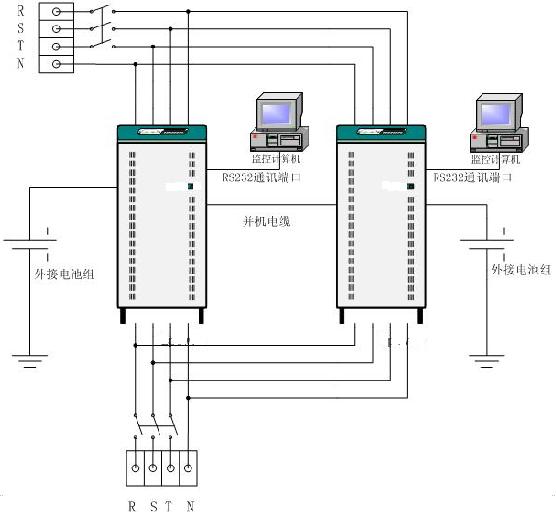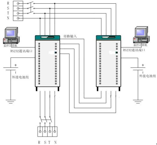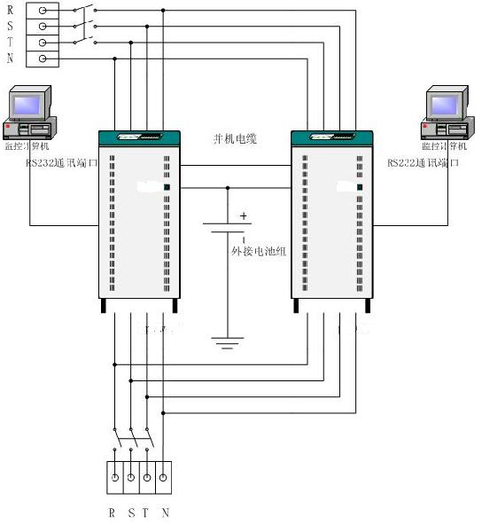 說(shuō)明:用2臺(tái)單機(jī)系列的UPS串聯(lián)運(yùn)行。即一臺(tái)作為主機(jī),另一臺(tái)的輸出接到主機(jī)的旁路輸入端,作為備用機(jī)。