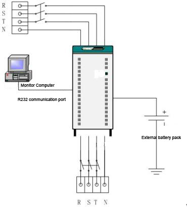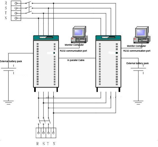 Description: using UPS of two single machines to run series operation, i.e. using one as the host, the other input receiving the host of the bypass, as a backup machine.